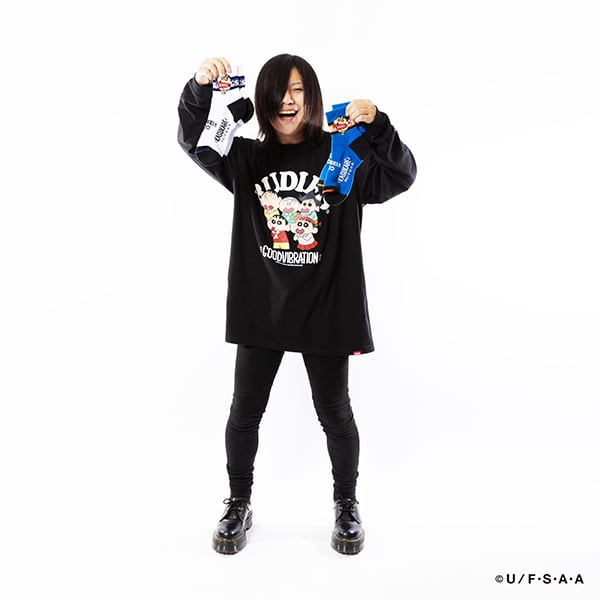 国民的人気アニメ「クレヨンしんちゃん」とRUDIE'Sのコラボレーション。クレヨンしんちゃんのオリジナルグラフィックに、RUDIE'Sテイストを加えたストリート感あふれる仕上がりとなっています。