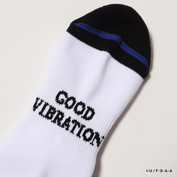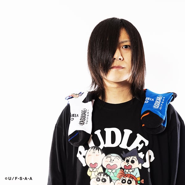 "MOSH"するクレヨンしんちゃんを様々なシューズに合わせやすいミドル丈のソックスに施しました。ブルー、ホワイトの2色展開です。